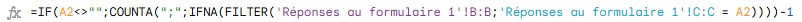 =IF(A2<> » »;COUNTA(« ; »;IFNA(FILTER(‘Réponses au formulaire 1′!B:B;’Réponses au formulaire 1’!C:C = A2))))-1