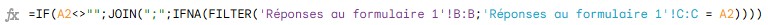 =IF(A2<> » »;JOIN(« ; »;IFNA(FILTER(‘Réponses au formulaire 1′!B:B;’Réponses au formulaire 1’!C:C = A2))))